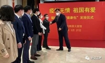 中国驻韩国大使馆27日举行“疫情无情,祖国有爱”留韩学子“健康包”发放仪式,中国驻韩国大使邢海明向留学人员代表发放了防疫“健康包”。