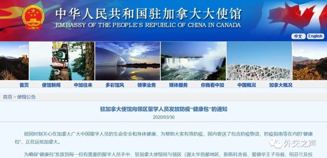 中国驻加拿大使馆将向领区留学人员发放“健康包”