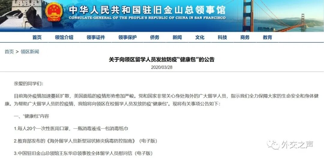 中国驻旧金山总领馆将给留学生发“健康包”