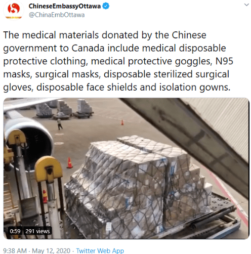 【本媒综合消息】2020年5月12日,中国驻加拿大大使馆今天在推特上连发两条重要消息,表示中国政府向加拿大捐赠的一大批医疗物资已于5月11日搭乘Cargojet货机运抵安省汉密尔顿国际机场。