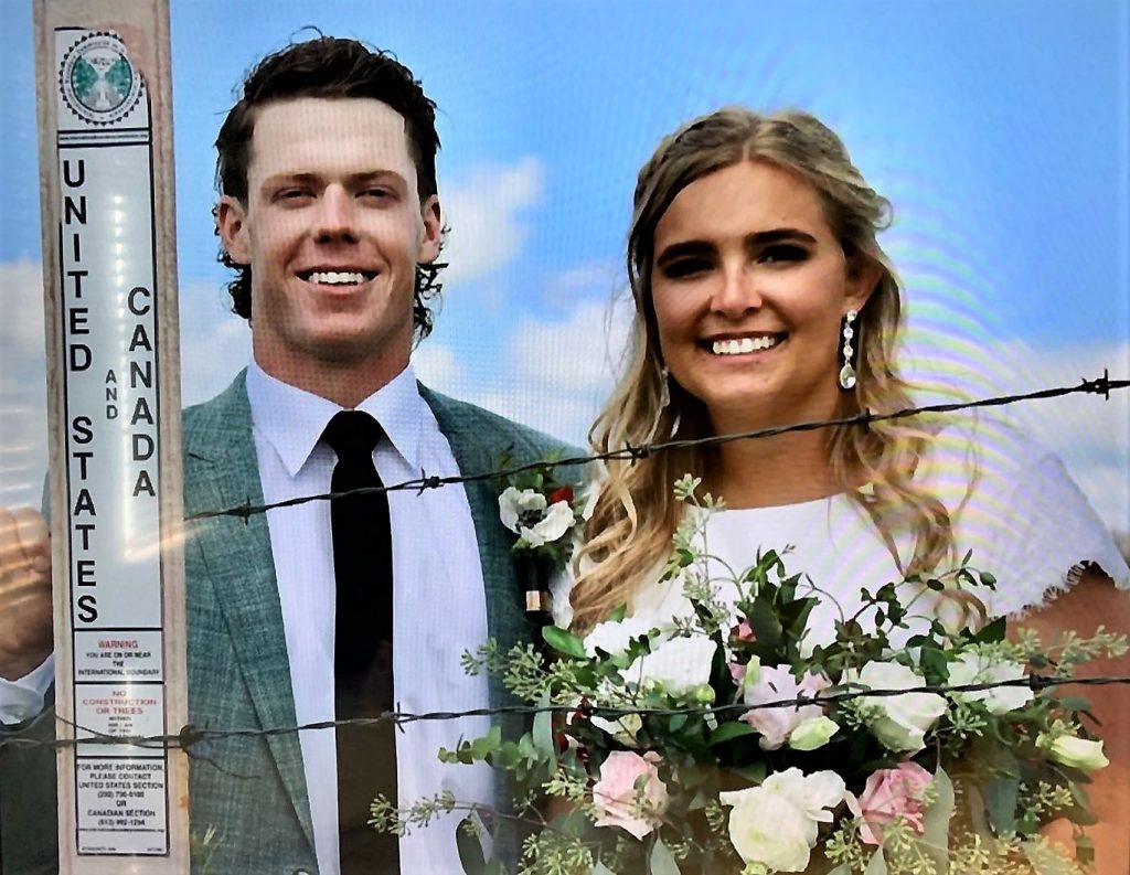 新婚夫妇及其家人聚集在一片完美的蓝色草原天空下,这是在加美边界高高的草丛中,蒙大拿州农场的加美边境铁丝网篱笆旁,两国的边境官员从远处注视着他们。