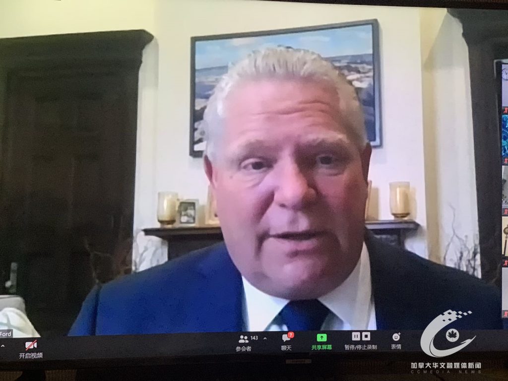 今天上午,安大略省省长福特出席了安省华裔议员柯文彬主持的视频会议,对多伦多华人团体联合总会等安省华人社团在抗击新冠病毒斗争中的杰出表现予以感谢和表彰。