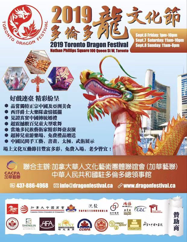 【加拿大华人文化艺术团体联谊会8月10日消息】2019(第二届)多伦多龙文化节将于9月6日至8日在多伦多市政厅广场隆重登场