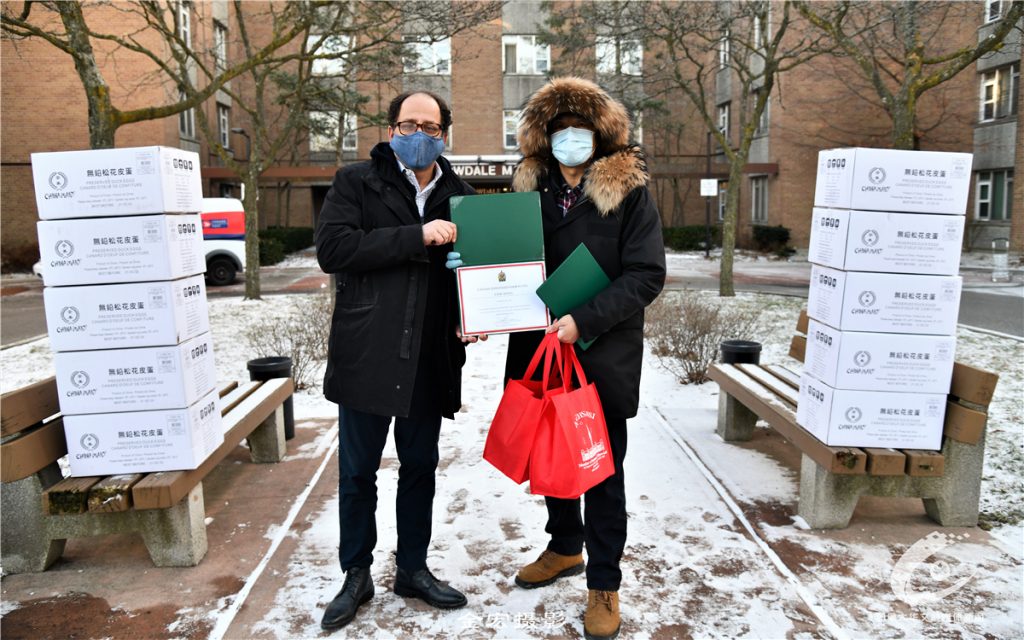 今天下午,王先生通过加拿大联邦国会议员艾盛思(Ali Ehsassi)向三家老人院捐赠了480件中国产无铅松花鸭蛋。
