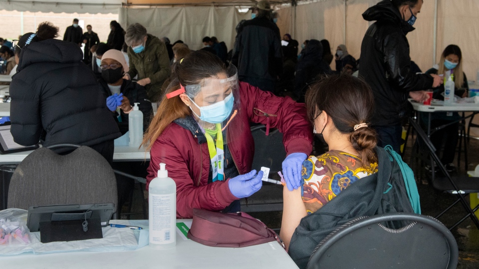 题头图片为2021年4月11日星期日,在多伦多桑克利夫公园,一名护士于临时注射点为民众注射COVID-19疫苗。