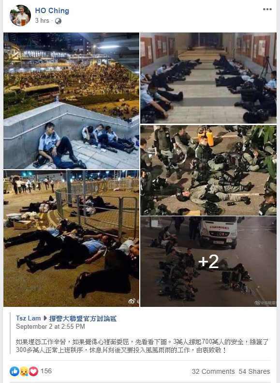 新加坡總理夫人何晶在Facebook社交網站發帖,向負責執法的香港警察致敬,貼文上寫「如果埋怨工作和覺得心裡受到委屈,先看看下圖,三萬多人撐起700萬人的安全,維護了300多萬人正常上班秩序,休息片刻又要投入風風雨雨的工作 ,由衷敬佩。」帖子裡附有六張警察太過勞累就地睡著的圖片。這張貼文在新加坡引起哄動和熱烈回响。