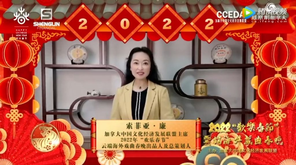 由加拿大中国文化经济发展联盟主办、加拿大中国戏曲文化交流协会协办、中国国粹文化艺术交流协会承办、凤凰网加拿大为战略合作伙伴、咸氏金融特别赞助、北美绿色国际钻石赞助的“龙腾虎跃庆新春”2022年“欢乐春节”云端海外戏曲春晚-第二届中国戏剧梅花奖群英会1月22日在YouTube、凤凰网加拿大及B站腾讯视频、bilibili、优酷视频、搜狐视频上全球线上演出获得圆满成功!