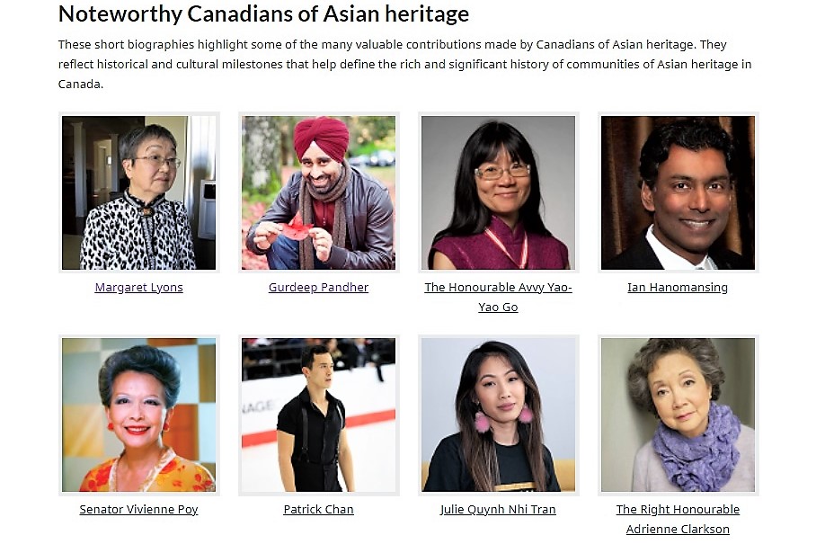 加拿大住房、多元及包容事务部列出的亚裔加拿大人中还包括多个集体,如1933年的华裔学生足球队、第一次世界大战中的锡克裔加拿大人、第二次世界大战中的华裔老兵等。
