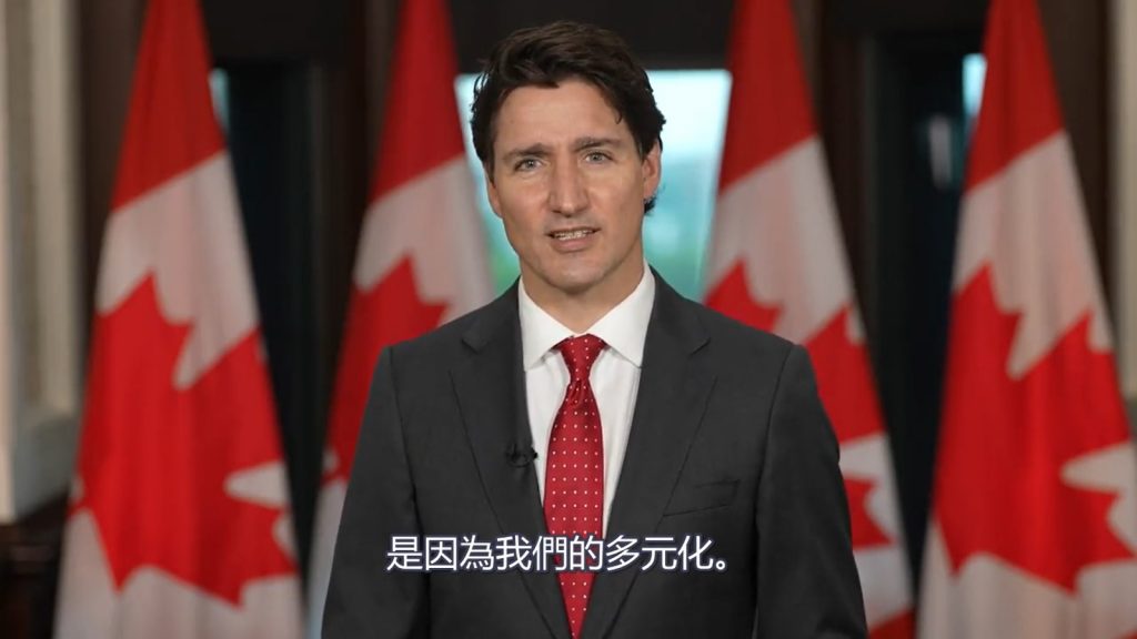 “加拿大之所以强劲,是因为我们的多元化。无论我们的信仰,我们的出生地,我们的肤色,我们所讲的语言,或者是我们所爱之人——我们都是这个伟大国家的平等成员。