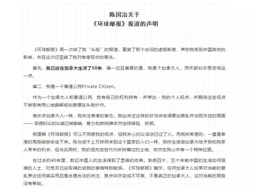 9月20日,加拿大安大略省前国际贸易厅长陈国治在个人微信公众号用中英文双语刊发关于《环球邮报》报道的声明,对《环球邮报》声称陈国治受到中国政府影响,歪曲陈国治对香港现状的看法进行澄清。