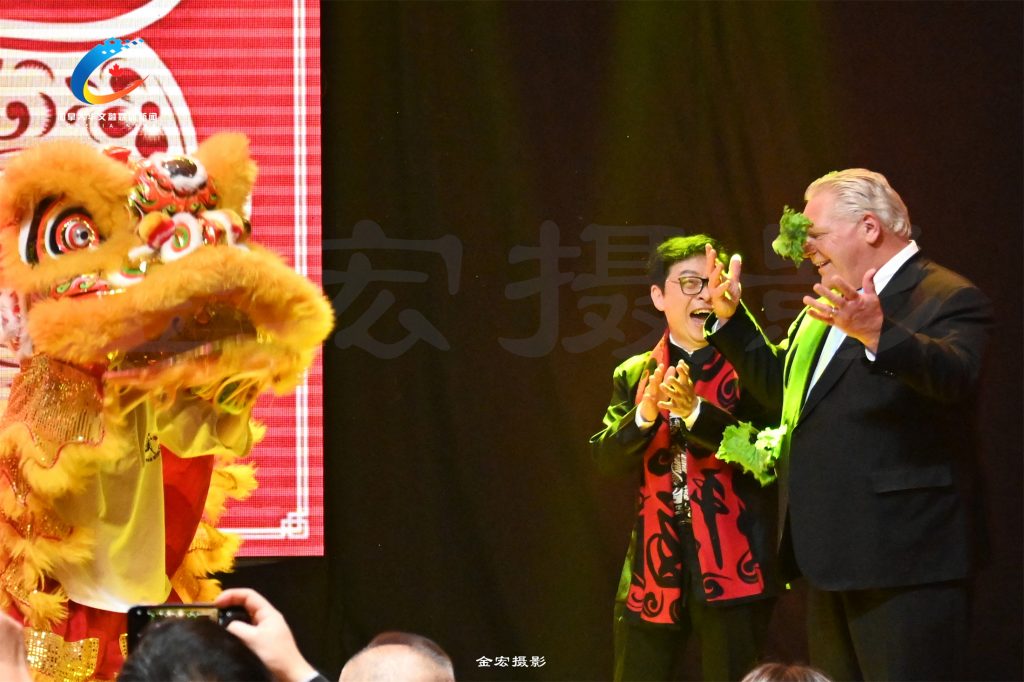 在开场举行的瑞狮采青仪式上,舞狮者将生菜直接抛到了福特省长的脸上——寓意财运当头,属大吉大利,全场掌声雷动