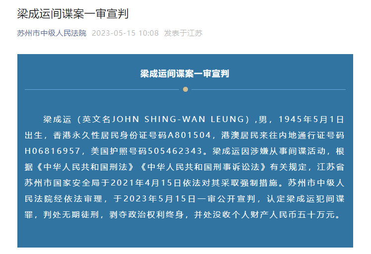 苏州市中级人民法院经依法审理,于2023年5月15日一审公开宣判,认定梁成运犯间谍罪,判处无期徒刑,剥夺政治权利终身,并处没收个人财产人民币五十万元。