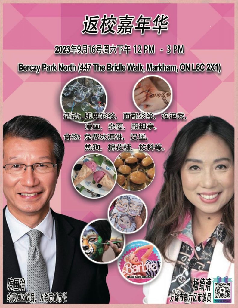 Collucci 议员和副市长 Michael Chan 将于 9 月 16日星期六中午 12 点至下午 3 点在 Berczy Park North(地址: 447 The Bridle Walk, Markham, ON L6C 2X1 )在第 6 区举办“重返校园欢乐博览会”。家庭和孩子们将会度过一段充满乐趣的时光,包括:
