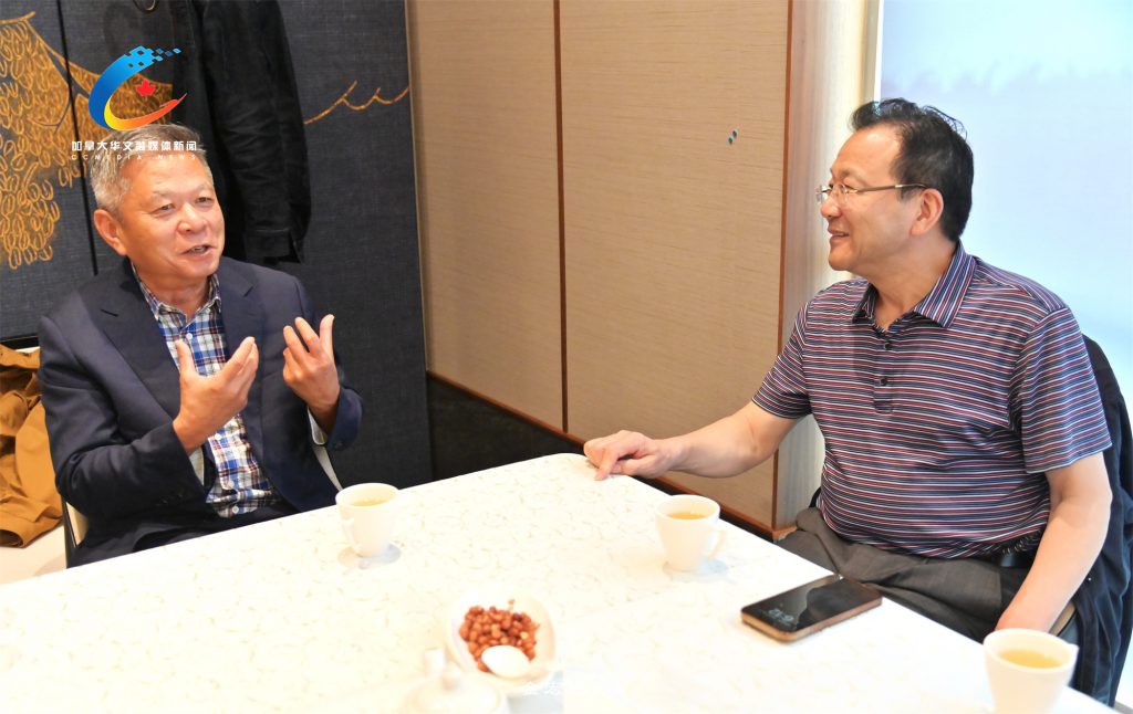 图为2023年8月第4届泛美武术锦标赛及首届国际武术名人堂颁奖典礼在加拿大万锦市举行期间,国际武联执行副主席、泛美武联主席吴廷贵,与锦标赛及首届国际武术名人堂颁奖典礼独家赞助商,加拿大汉嘉酒业董事长马君强交谈