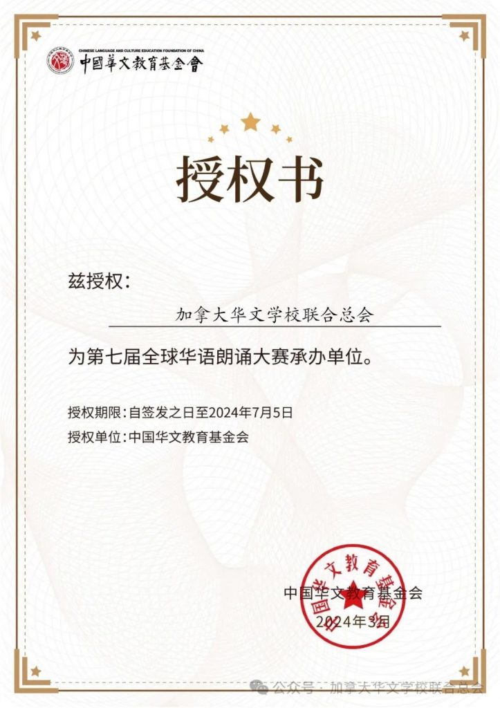 多元文化艺术 【第七届全球华语朗诵大赛】加拿大赛区选拔赛开始报名 2024年04月01日 主办单位:中国华文教育基金会国内协办单位:北京世侨优越国际教育科技有限公司资助单位:完美(中国)有限公司加拿大承办单位:加拿大华文学校联合总会冠名媒体:蒙城汇 全球华语朗诵大赛由中国华文教育基金会主办,自2018年至今已连续举办六届。数万名华裔学生通过参加大赛得到锻炼,收获成长;大赛得到学生、家长及当地社会的更多认同和信任,已经成为华裔青少年展现语言能力、树立民族文化自信的重要舞台,也成为华文学校展示教学成果和交流教学经验的有效平台。 2024第七届全球华语朗诵大赛已正式启动,加拿大华文学校联合总会很荣幸地继续成为本次大赛加拿大赛区的承办单位。感谢中国驻加拿大大使馆,蒙特利尔总领事馆和多伦多总领事馆对朗诵大赛的大力支持!欢迎所有的华文教育及相关团体组织学生报名参加。希望通过朗诵大赛向世界传达加拿大华裔青少年勇敢自信,传承中华文化的精神风貌! 参赛资格 在加拿大出生或在加拿大定居的3岁至18岁华裔青少年(在华校就读的非华裔青少年亦可报名参赛)。 组别 (1)幼儿组:3-6岁(2017.8.1至2021.7.31期间出生); (2)少儿组:7-10岁(2013.8.1至2017.7.31期间出生); (3)少年组:11-15岁(2008.8.1至2013.7.31期间出生); (4)青少组:16-18岁(2005.8.1至2008.7.31期间出生)。 除幼儿组外,其他3个组别的参赛选手截至比赛启动时,须在海外连续居住满3年以上。 作品选择 选手可选诵中外文学艺术作品,或自创作品,避免涉及易引发争议的敏感话题。 语言要求 为突出华裔青少年身份特征,选手在朗诵中可少量使用住在国官方语言(不超过作品总时长10%),并在其后以中文译文诵读;选手可部分使用在中国有较大影响力的方言(不超过作品总时长20%),如粤语、闽南语、潮州话、客家话、福州话、温州话、青田话等南方语系方言,并在其后将方言内容以汉语普通话诵读。 背景音乐 选手自主决定朗诵过程是否播放背景音乐,如播放背景音乐,仅可用纯旋律音乐。 影像要求 作品视频须一镜到底,横屏拍摄,MP4格式,1080p 30fps ,幼儿组作品时长不短于60秒,其余组别作品时长不短于90秒。以作品名称+选手姓名+参赛组别命名。 决赛奖项设置及奖励办法 国家奖项 (1)等级奖:金奖、银奖、铜奖、优秀奖; (2)单项奖:按组别设置最具潜质奖、最佳风采奖、最佳形象奖; (3)优秀组织奖:主办方根据承办机构对赛事的组织情况进行综合评定,评选出优秀组织奖。 加拿大赛区额外奖金 在全球获得金银铜奖的额外奖励: 金奖:$200 银奖:$100 铜奖:$50 为所有参赛选手颁发荣誉证书。 国家奖励办法 (1)根据比赛成绩和各赛区参赛选手数量分配集结营名额。 (2)向晋级决赛的选手颁发电子版荣誉证书,向其他参赛选手颁发纪念证书,纪念证书由承办机构发放。 (3)部分优秀作品将在国务院侨办网站、“云上华文”平台、中国华文教育基金会微信视频号等平台展示,基金会也会将优秀作品向国内各大媒体进行推荐。 报名及作品提交 *报名程序中有参赛学校名称,请选择你所属或选择的学校 *即日起开始报名,截止日期:4月20日(4月20日以后收到的所有报名无效) * 作品上传截止日期:4月30日(4月30日以后收到的作品的视作无效) 扫描下方二维码报名并提交作品(请家长用自己谷歌账号登录,可先报名,后使用同一账号提交作品) 或复制下方链接:↓ `https://docs.google.com/forms/d/e/1FAIpQLSfvTf2o4BLGW99u6OhW4MZ5LFp5tHHAXkEFMRNlUZl9eMB6Fg/viewform?usp=sf_link 文件名写明:参赛选手姓名+组别 免费培训选手 报名参赛的所有学生,免费接受国家级专家赛前辅导的多类培训。 比如: 扫码联系我们 扫码联系我们 特别声明 选手提交参赛视频即视为授权主办方拥有选手在视频中的肖像使用权,主办方承诺视频仅用于与大赛相关的媒体宣传活动。 参赛选手按照年龄分组报名,不得降级虚报组别;请勿在不同承办机构重复报名参赛,否则将取消选手参赛资格。 主办方享有赛事全过程的其他权益。 主办方享有本次赛事最终解释权。 协办和参赛单位 (按加盟时间顺序排列) 蒙特利尔孔子学校 加拿大多元国际教育 博尔沙中文学校 更优双快中文学校 加拿大易中文学校 渥太华欣华中文学校 友仁学堂 GMCCA蒙克顿中文学校 小龙人汉语 大温莎中国艺术学院 香柏文化中文学校 大宇语言艺术研习社 张韩声乐工作室 凤力朗诵主持工作室 加中友谊促进会 紫龙语言工作坊 加拿大慧鱼教育 蒙特利尔书法家协会 渥太华天天中文学校 欢迎加盟 支持媒体 (按加盟时间顺序排列) 西岛生活 加拿大共生国际传媒 魁北客 加拿大华艺传媒新闻网 新加园 HiCity 蒙城今日 侨社速报 华人头条 加拿大华文融媒体新闻 传奇文化传媒 轻松加拿大 环球华语电视台 . 欢迎加盟 支持单位 加拿大蒙特利尔华人联合总会 加拿大上海商会 加拿大满城华人服务中心 南岸华人服务中心 . 招集参赛单位 欢迎更多华文学校、华文教育机构及华人社团成为协办和参赛单位 欢迎友情赞助 欢迎华文教育有情结的更多商业机构和个人赞助本次活动 欢迎媒体加盟 欢迎支持媒体加盟本次比赛 加拿大华文学校联合总会是一个非盈利,非政治,非宗教的社会团体。协会旨在促进全加拿大华文教育的开发和中华文化的宣传,联合华文教育和中华文化宣传领域资源,互通有无,为当地华文教育