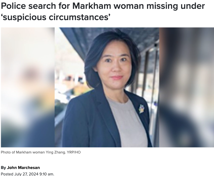 张英最后一次出现是在 7 月 25 日上午 10 点 40 分左右,地点是万锦市 Woodbine Avenue 和 Steelcase Road 附近。