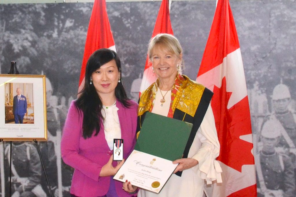 图为加拿大联邦国会议员Leah Taylor Roy向张杰颁发国王查尔斯三世加冕勋章