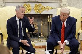 美国总统唐纳德·特朗普和加拿大总理马克·卡尼在白宫椭圆形办公室会面时的反应。 (伊芙琳·霍克斯坦/路透社) 卡尼列举了对特朗普的一些赞扬,包括他对经济的“改造”、他的一些和平协议以及“使伊朗不再是恐怖力量”。