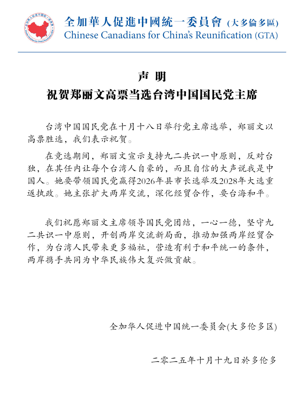 全加华人促进中国统一委员会(大多伦多区)、加拿大华人促进中国统-(GTA)今天发表声明,祝贺郑丽文高票当选台湾中国国民党主席。
