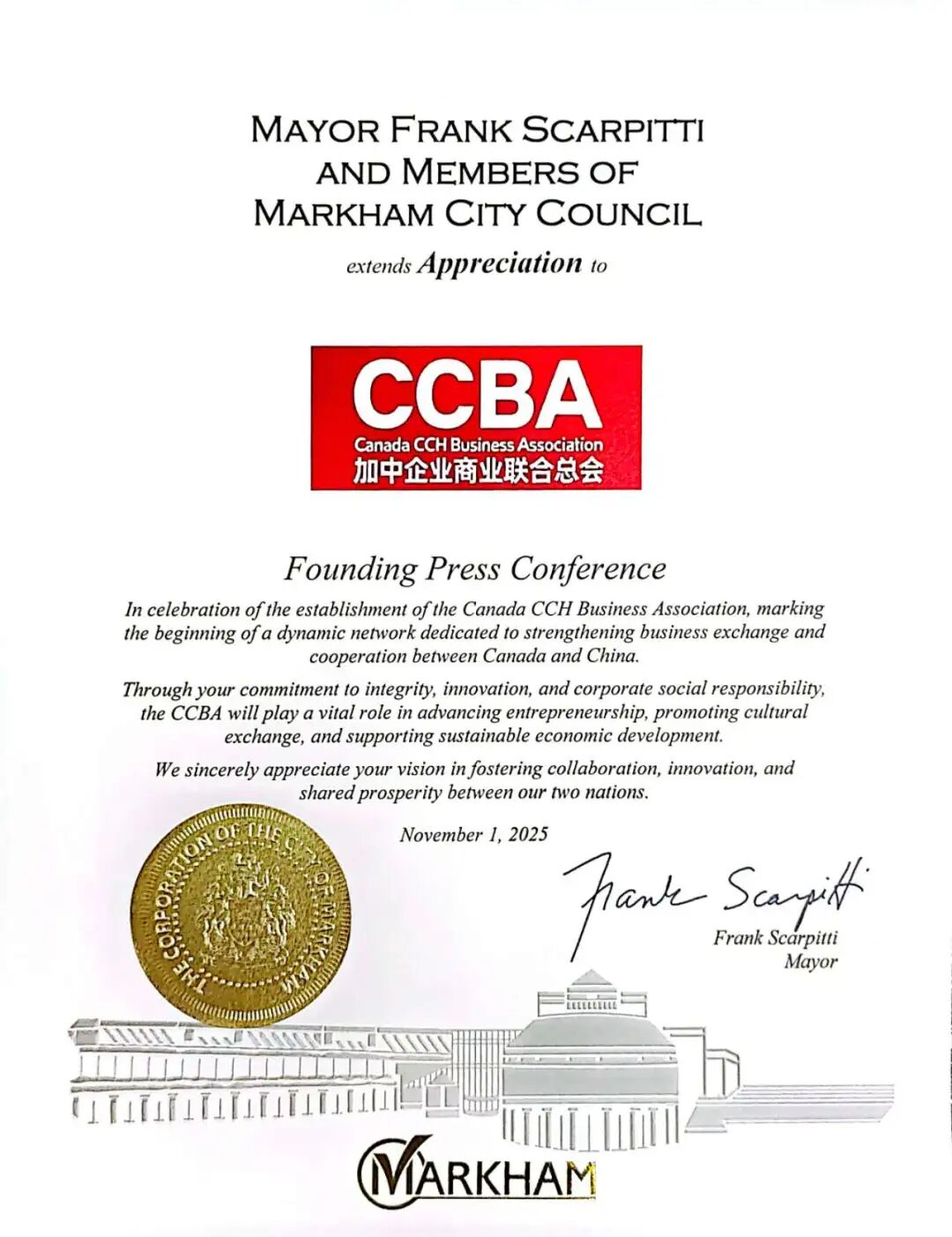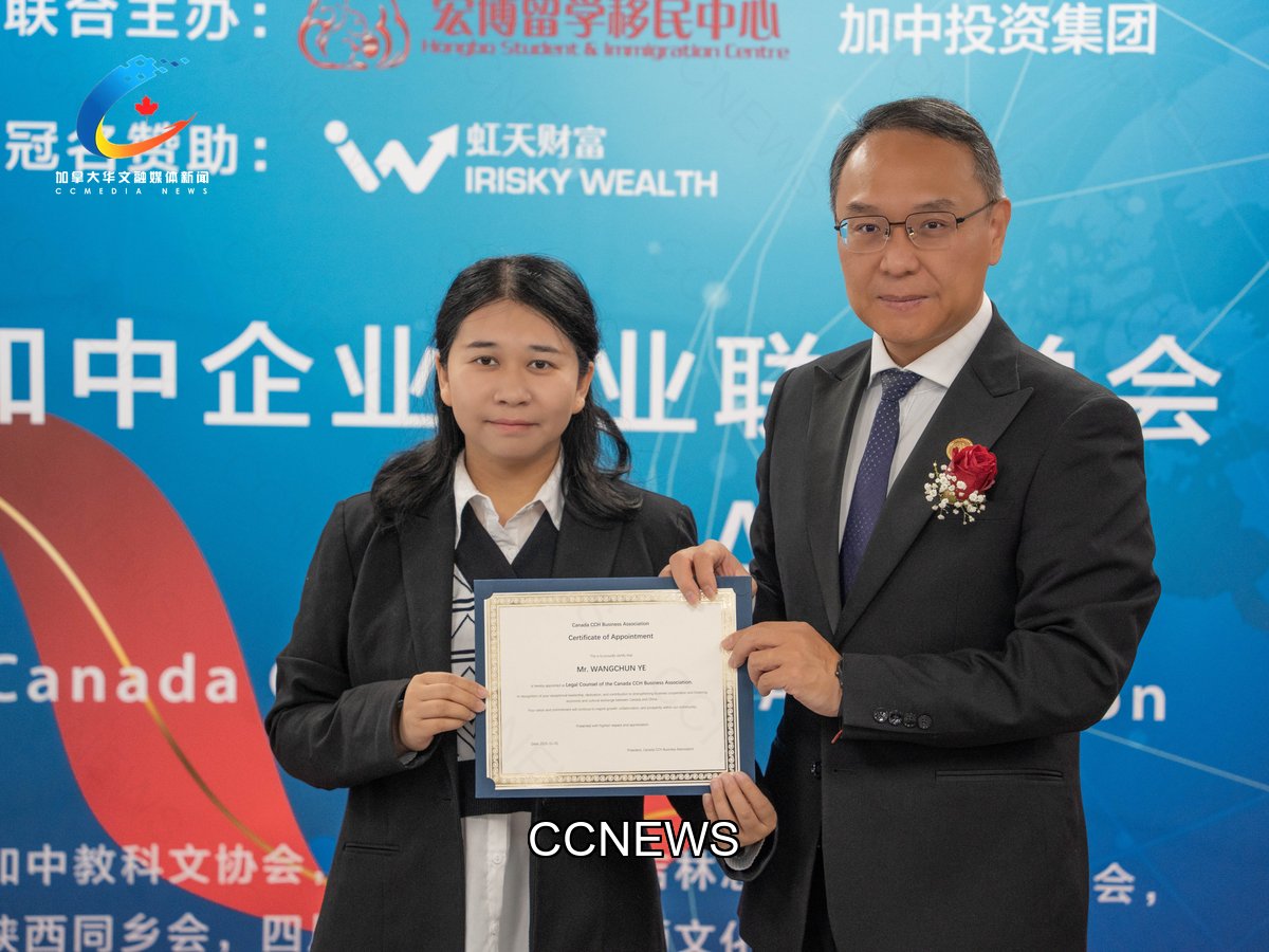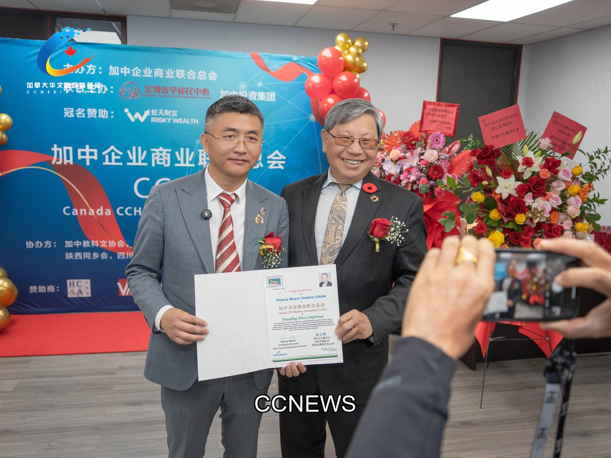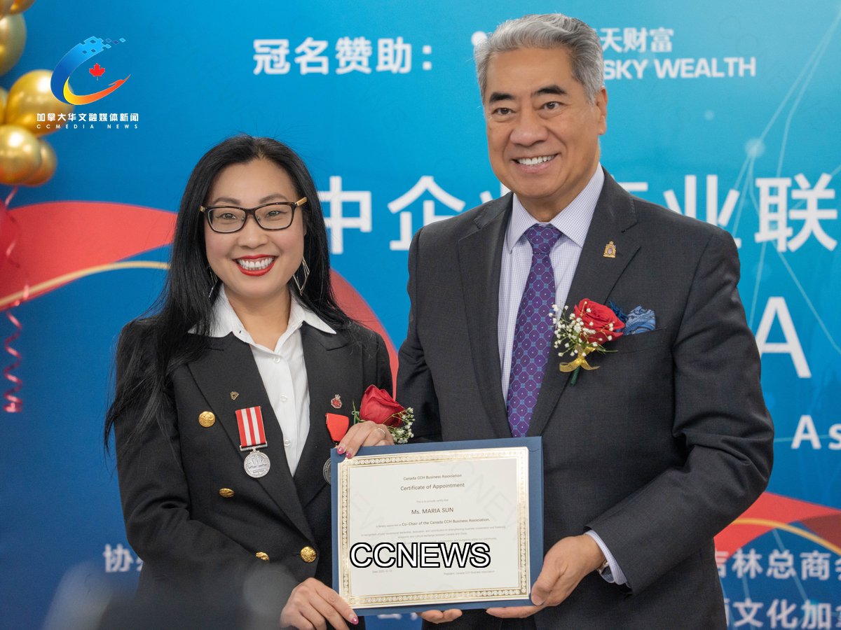 2025年11月1日,加中企业商业联合总会Canada CCH Business Association(简称商联会 CCBA )成立庆典暨新闻发布会在万锦市160 Royal Crest Court隆重举行。加拿大三级政府政要嘉宾莅临、与会35家知名会员企业代表包括金融、教育、科技、贸易等多个领域的行业翘楚,以及近20家主流媒体参加庆典活动,共同见证和庆祝加中企业商业联合总会正式成立。