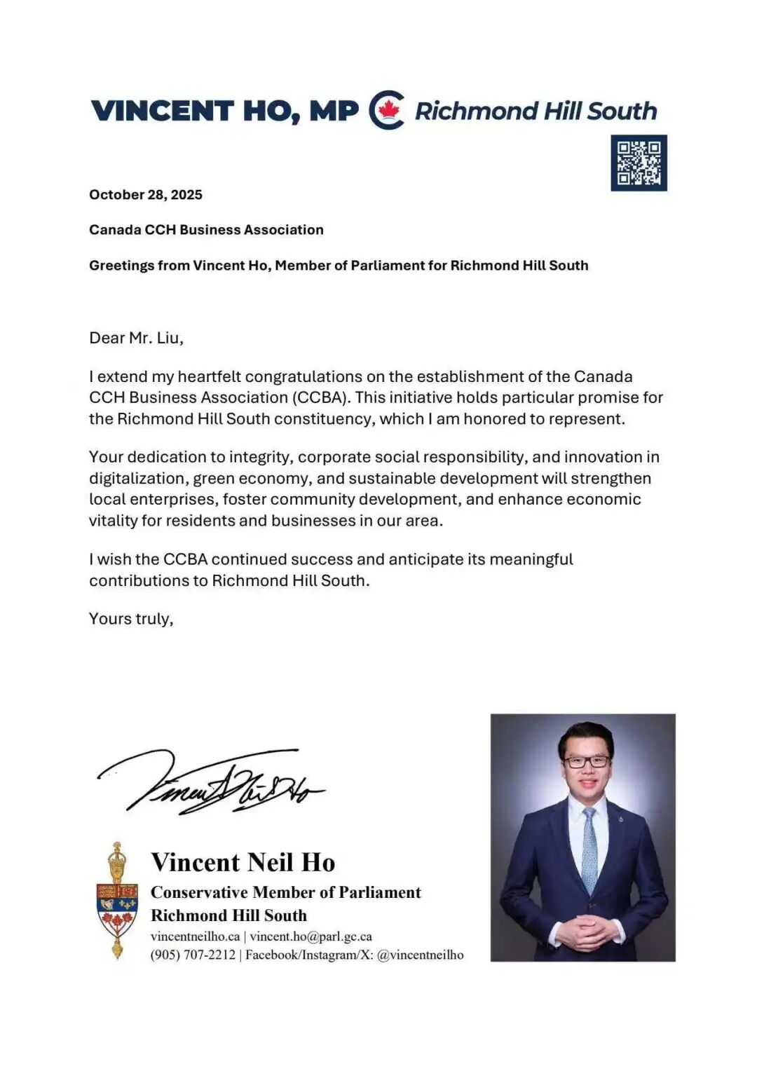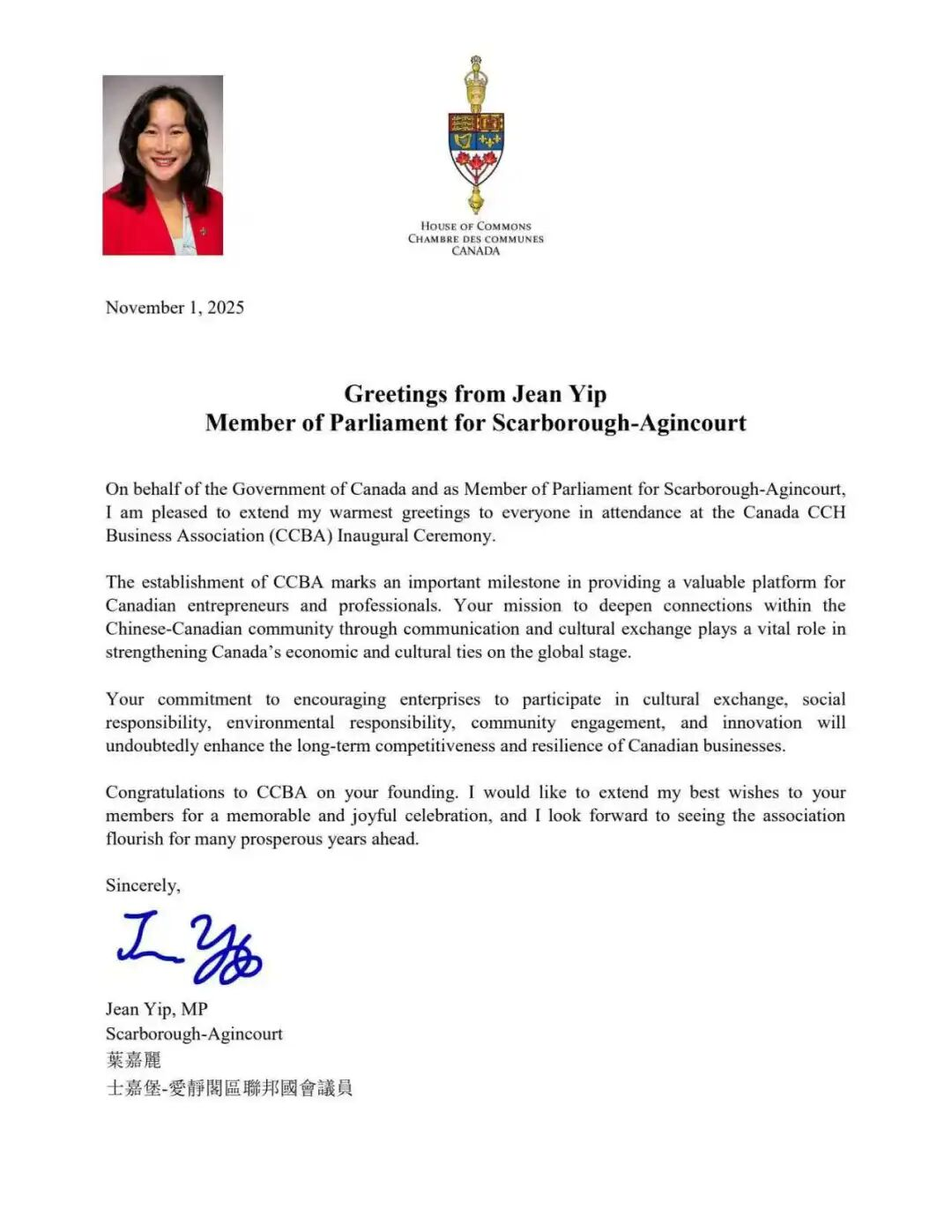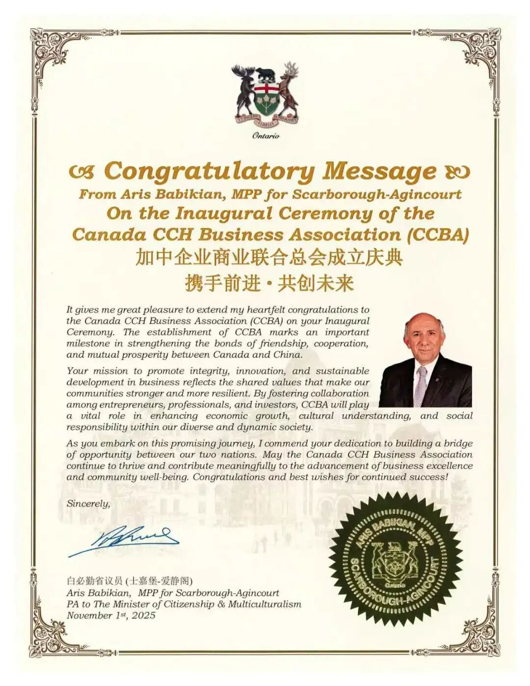 联邦国会议员叶嘉丽、聯邦國會議員 Vincent Ho、安省议员白必勤(Aris Babikian),万锦市市长薛家平 (Frank Scarpitti) 纷纷发来贺信表示祝贺,体现了各级政府对促进加中商业合作的高度重视。
