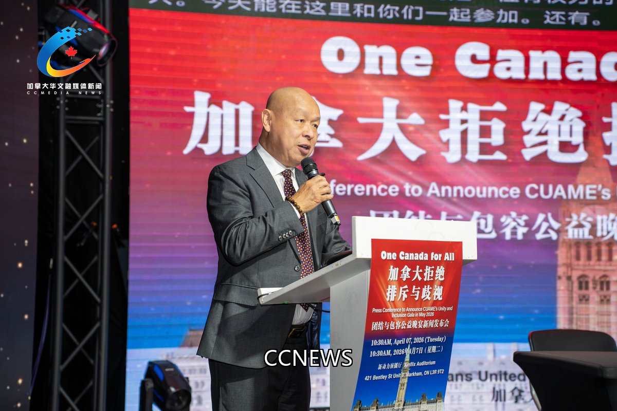 2026年4月7日,加拿大反歧视、反排外联盟(Canadians United Against Modern Exclusion,CUAME)主办、加拿大华人公共事务联合促进会(United Promotion Council of Canadian Public Affairs,UPCCPA)协办的“加拿大拒绝排斥与歧视筹款晚宴”(One Canada For All CUAME Unity and Inclusion Fundraising Gala)新闻发布会,在万锦市新动力演播厅顺利举行。会上正式宣布,该筹款晚宴将于5月1日在多伦多士嘉堡豪门宴餐馆(Casa Deluz Banquet Hall)举办。
