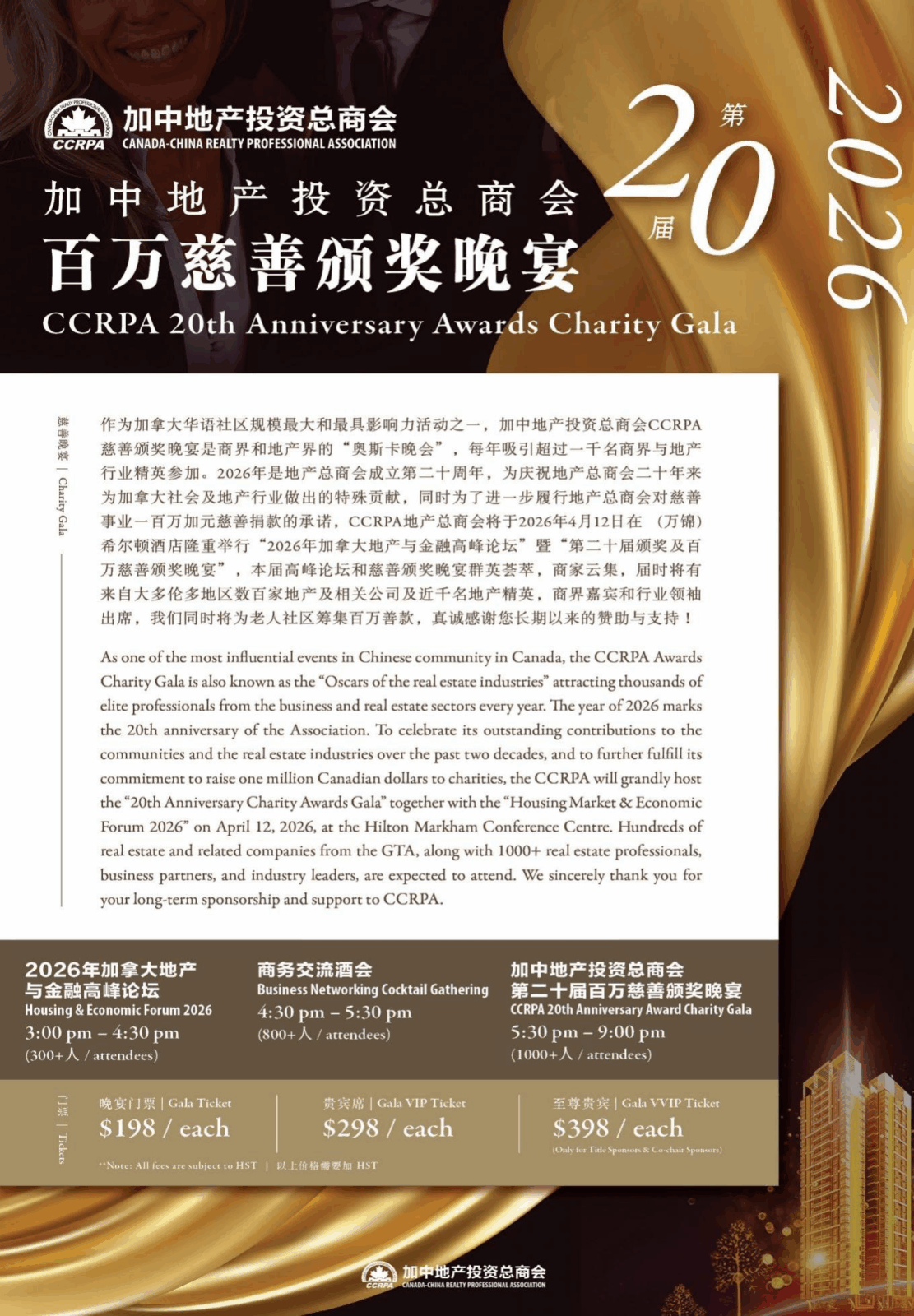 2026年,恰逢加中地产投资总商会CCRPA成立二十周年。为庆祝地产总商会CCRPA二十年来为加拿大社会及地产行业作出的卓越贡献,同时进一步履行CCRPA对慈善事业累计一百万加元捐赠的庄严承诺,会长孙志峰Steven Sun正式宣布:2026年4月12日(星期日),加中地产投资总商会CCRPA将在万锦市希尔顿会议中心Hilton Toronto Markham Suite Conference Centre隆重举办由中国茅台冠名赞助支持的「CCRPA第二十届百万慈善颁奖典礼晚宴」,本届活动将汇聚来自大多伦多地区数百家地产及相关企业,近千名地产精英、商界嘉宾及行业领袖齐聚一堂,鼓舞士气,奖励先进,同时履行社会责任与担当,为老人社区筹集百万善款,以实际行动回馈社会。