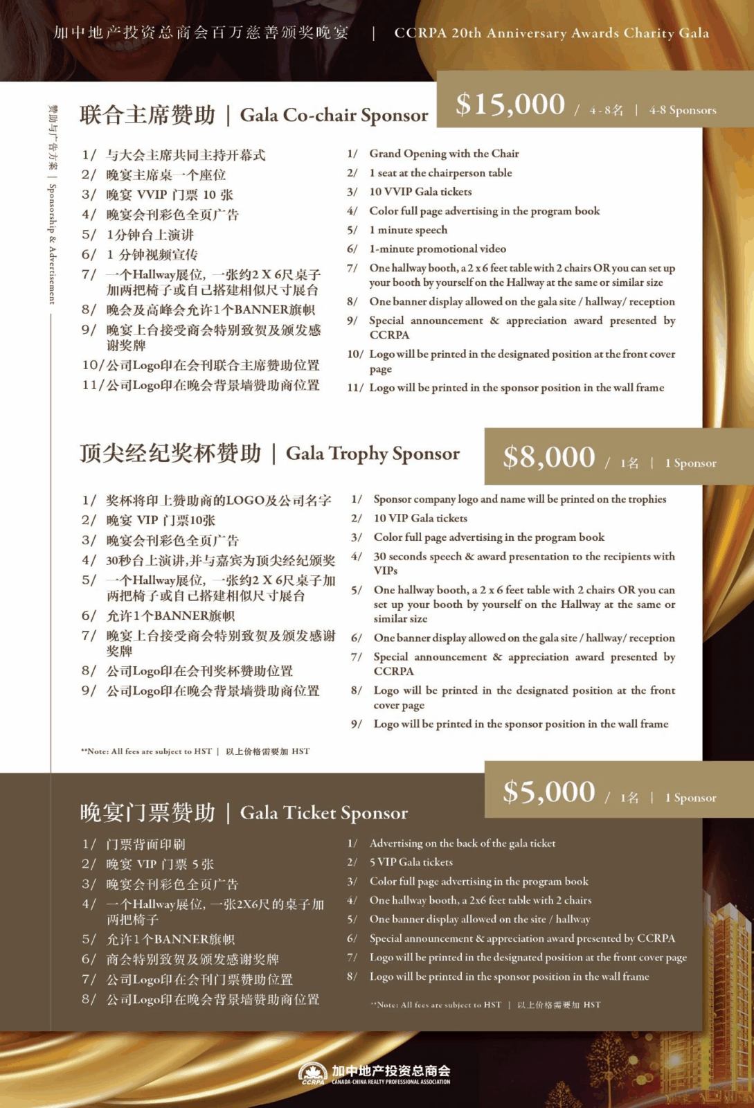 第二十届百万慈善颁奖典礼晚宴 CCRPA Award Charity GALA:5:30 – 9:00 pm
