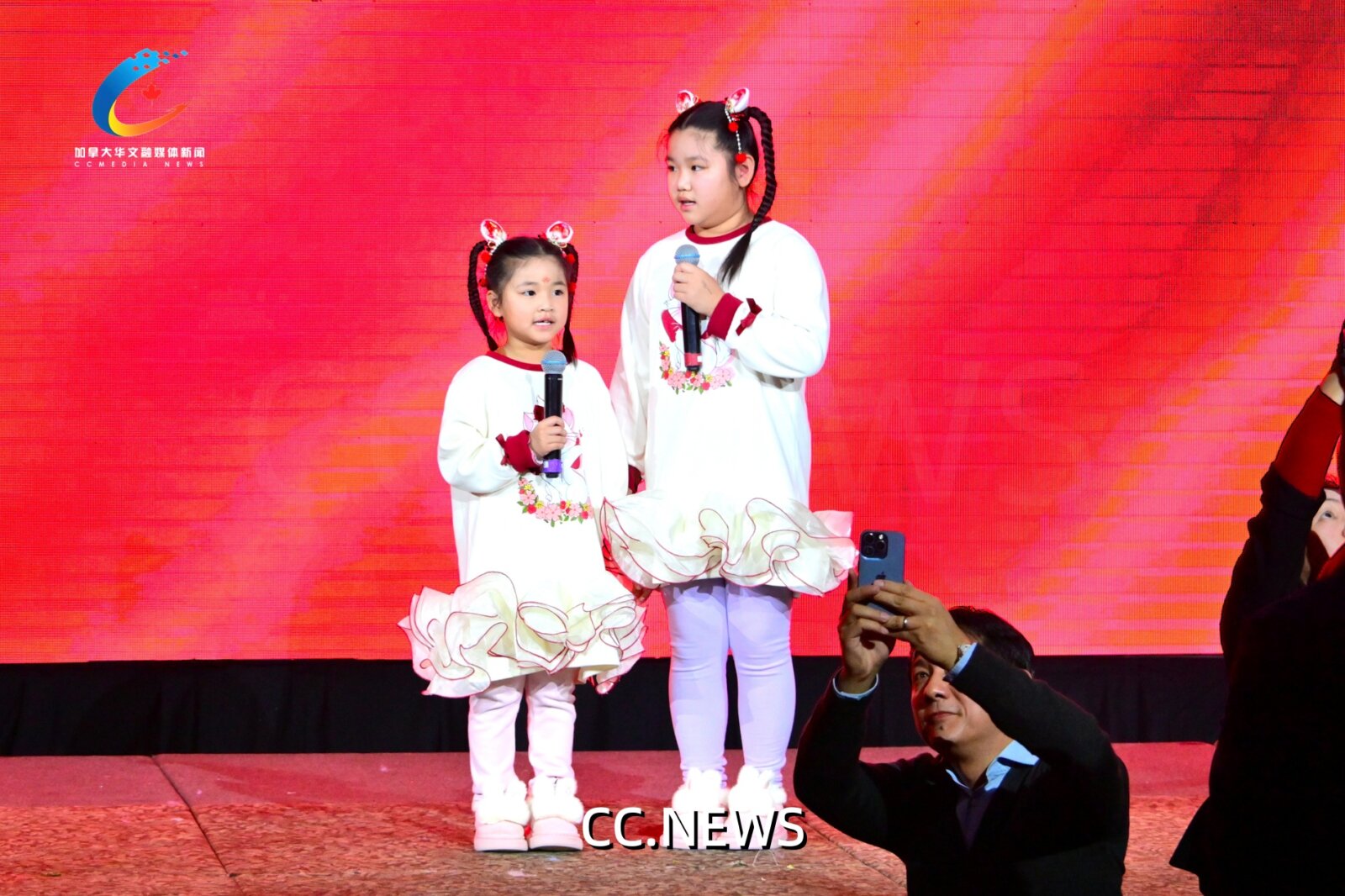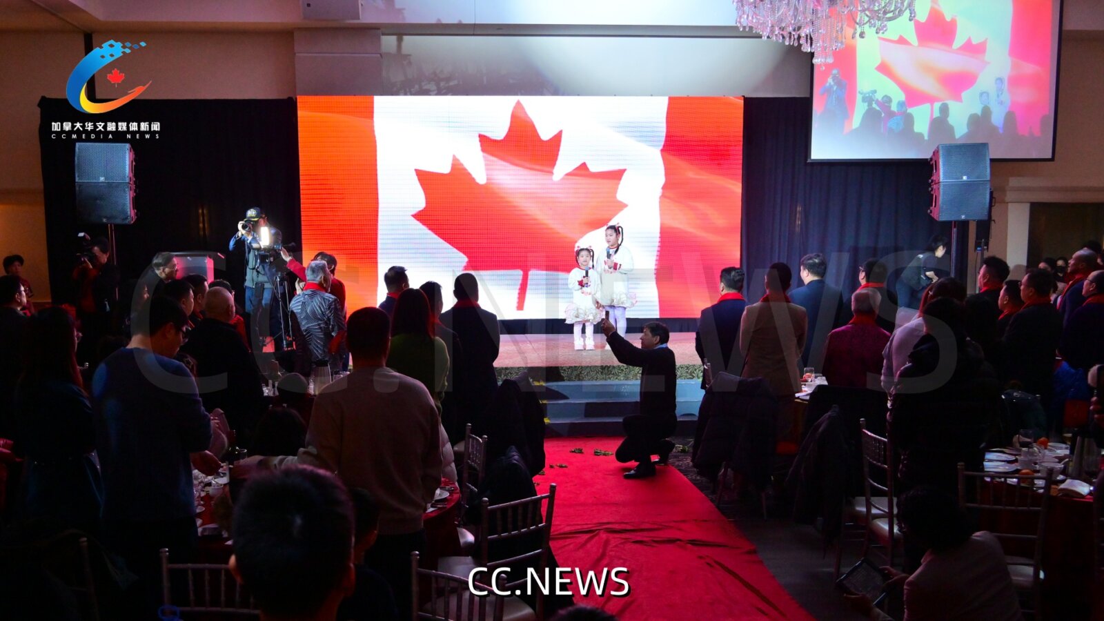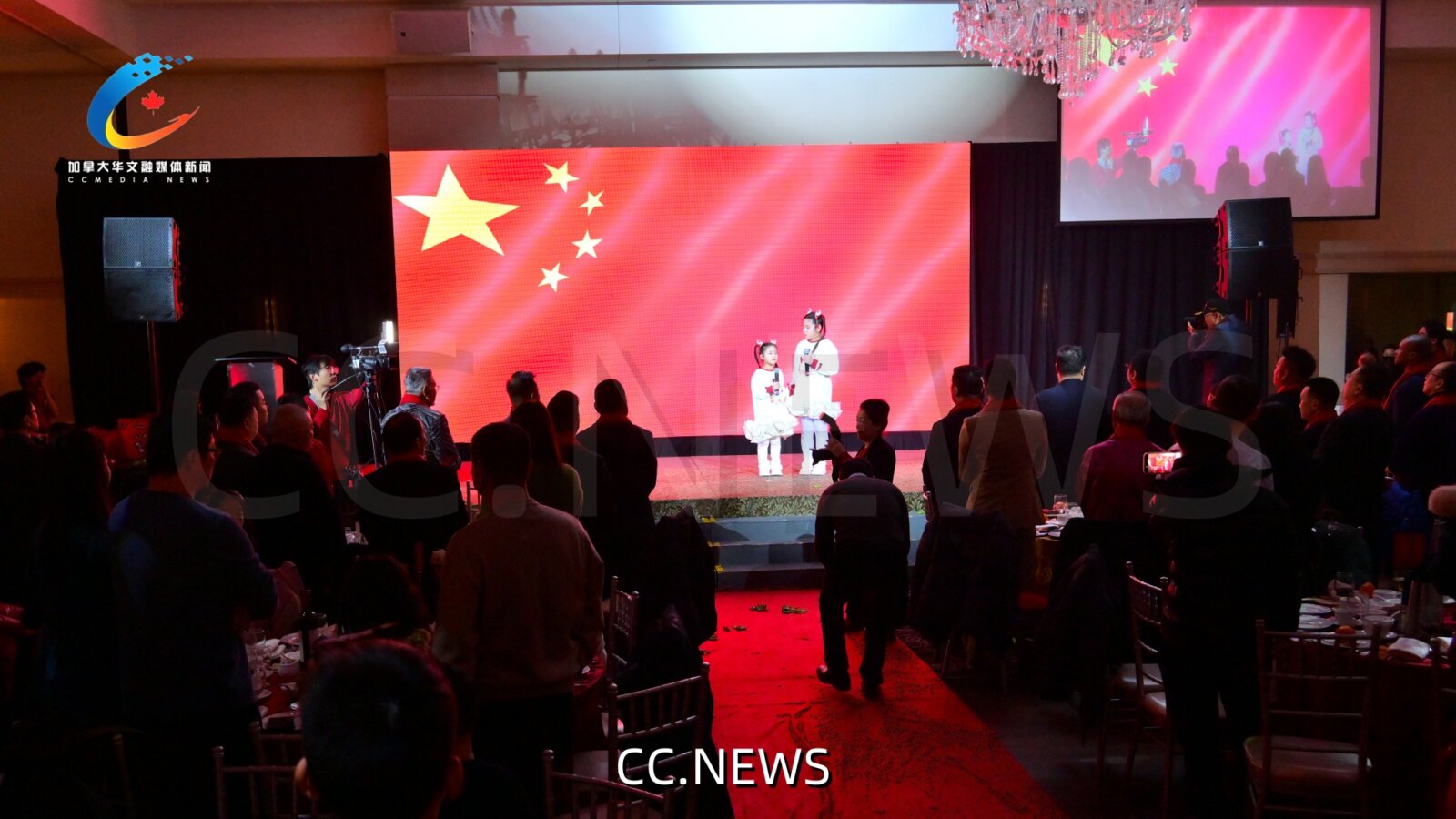 全场嘉宾起立,在 Mengqi Anny Gao 和 Lingxi Ainny Gao 两位优秀儿童的领唱下,嘹亮的加中两国国歌声响彻宴会厅 。