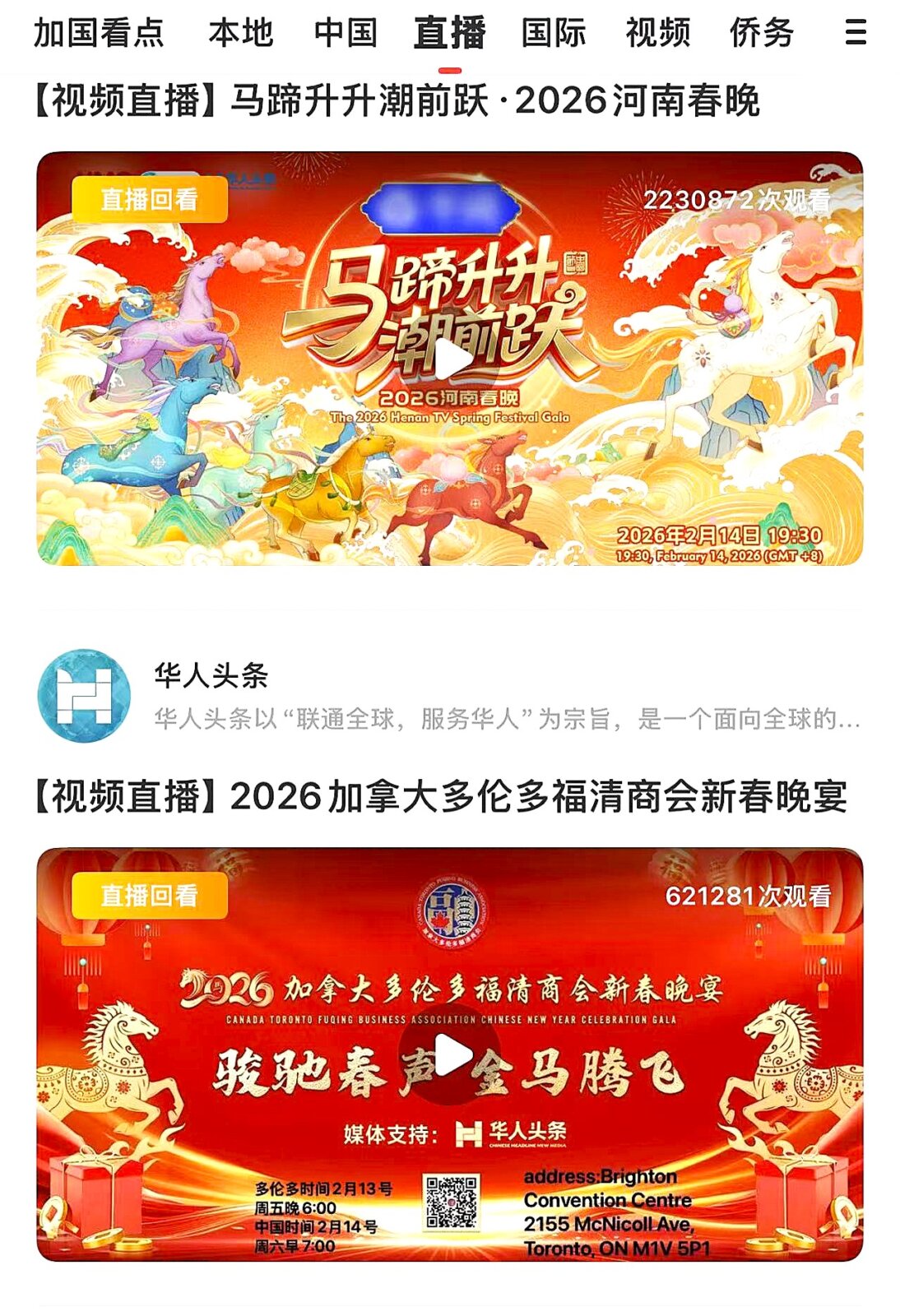 全球性新媒体【华人头条】对本场晚会进行了现场直播,并通过其全球170个站点及50多个媒体合作伙伴向8千万AP会员推送, 截止发稿时,视频点击量逾62万