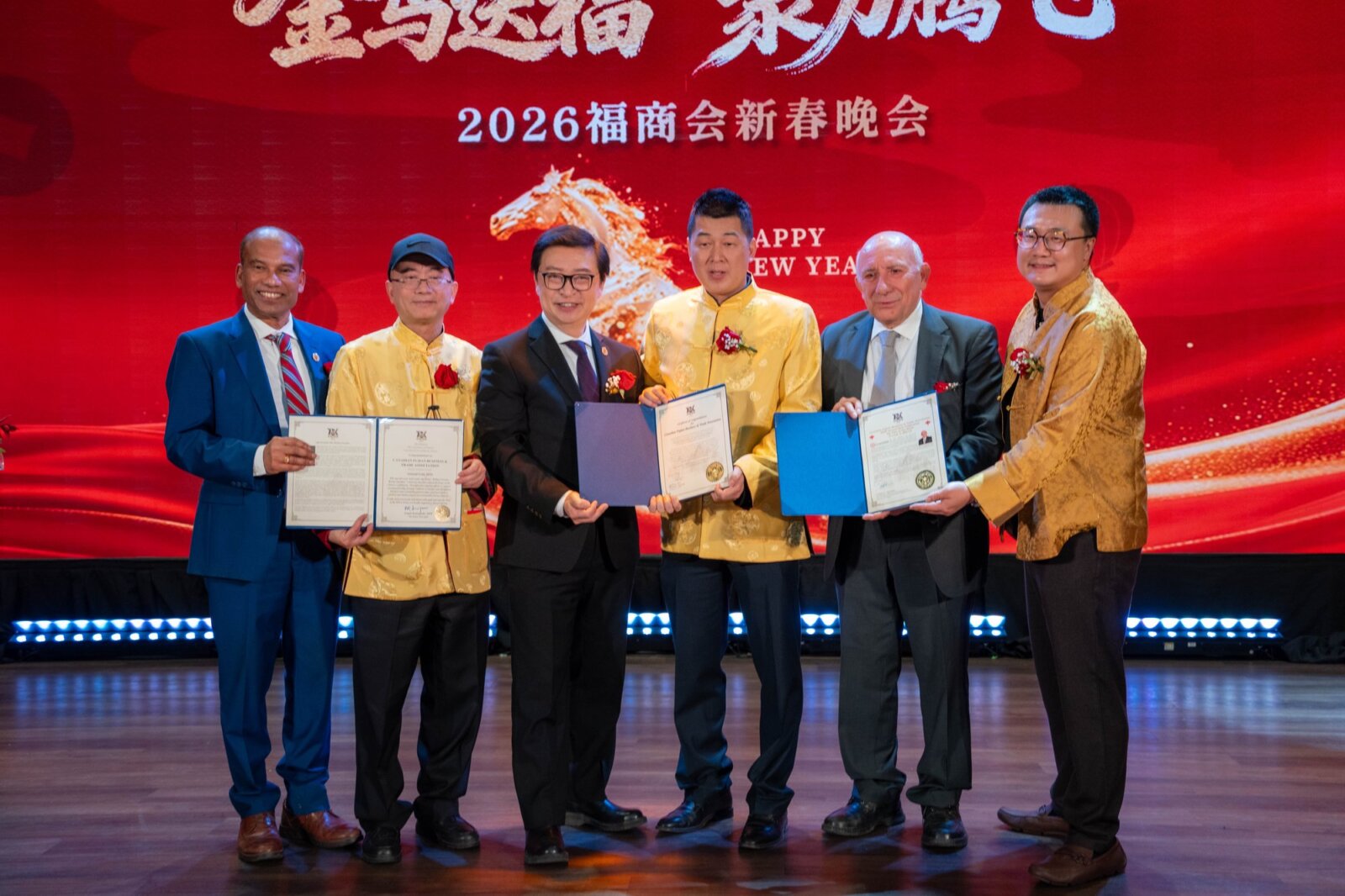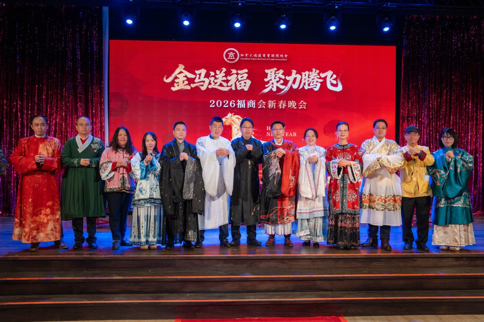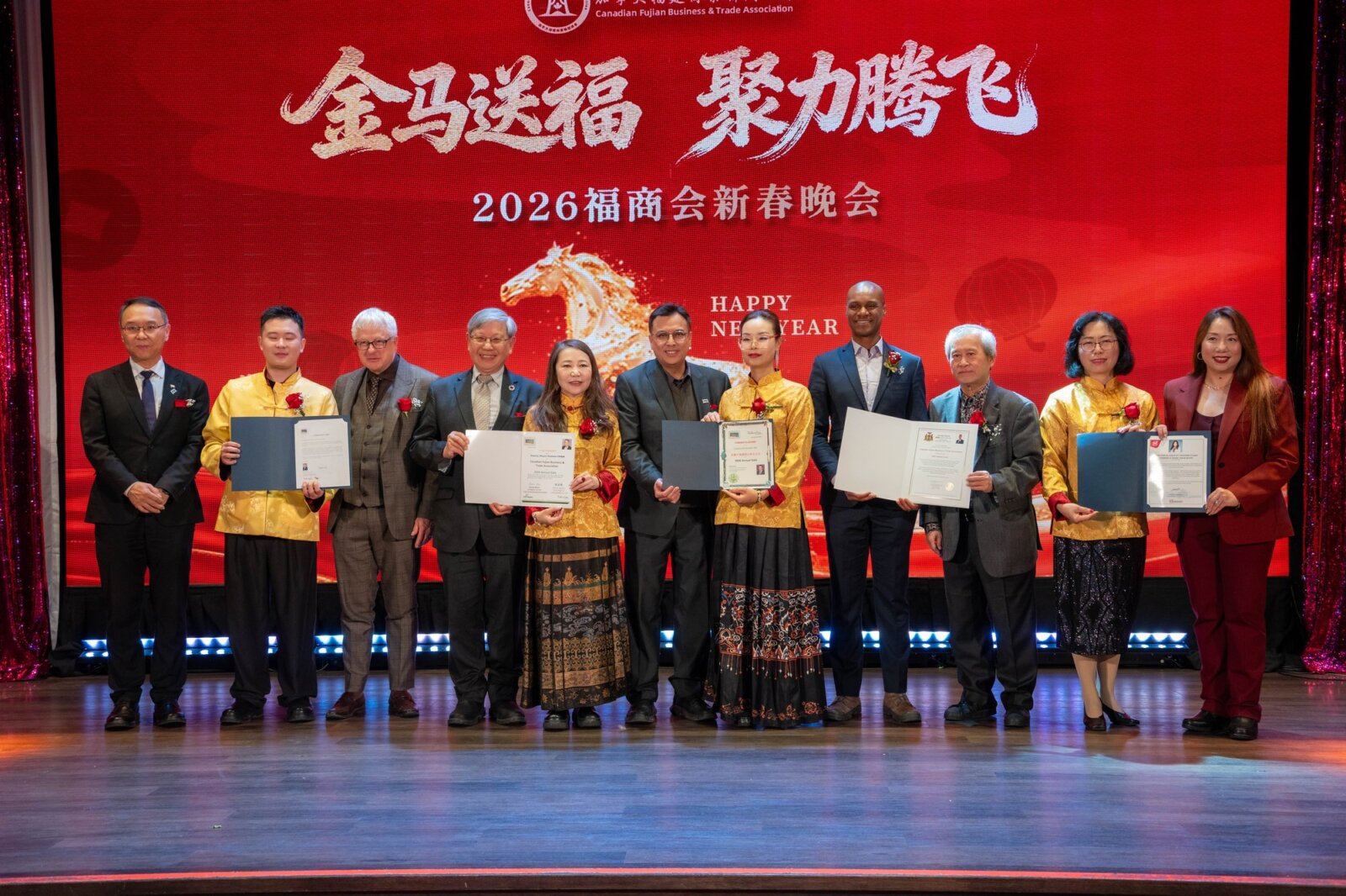 在辞旧迎新的美好时刻,加拿大福建商业联合总会(以下简称“福商会”)隆重举办以“金马送福·聚力腾飞”为主题的2026新春晚会。来自加拿大联邦、省、市三级政府官员,友好商会代表、社团精英及商界翘楚等近500位嘉宾齐聚一堂,共同迎接充满希望与活力的中国传统马年新春。