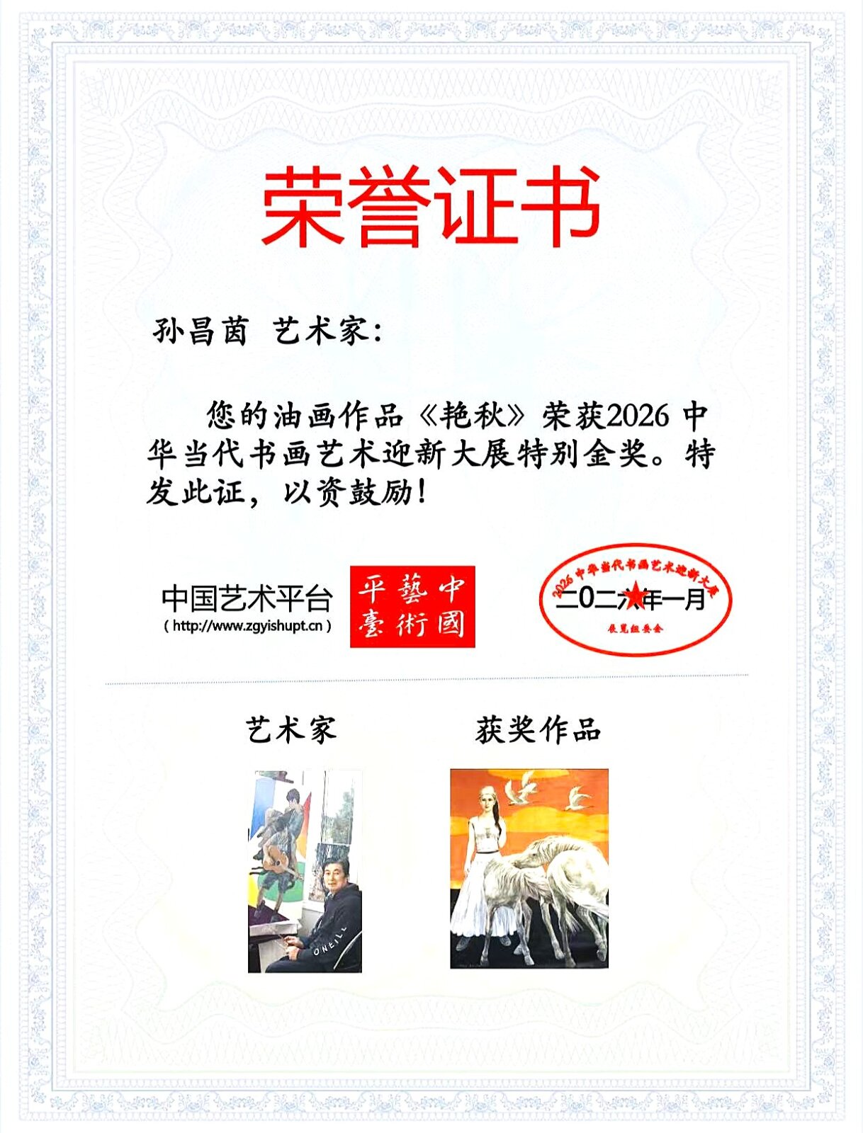 在今年元月,由中国艺术平台举办的【2026中华当代书画艺术迎新大展】评选中, 加拿大著名华人画家孙昌茵荣获特别金奖