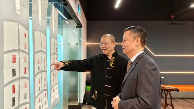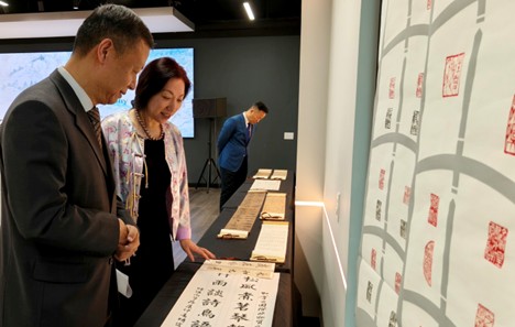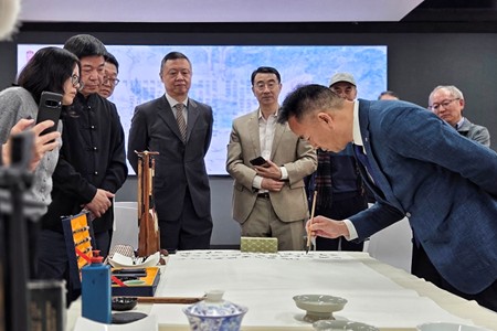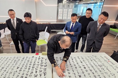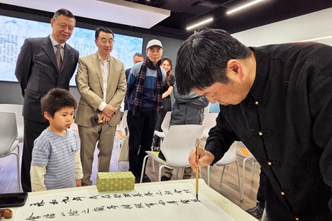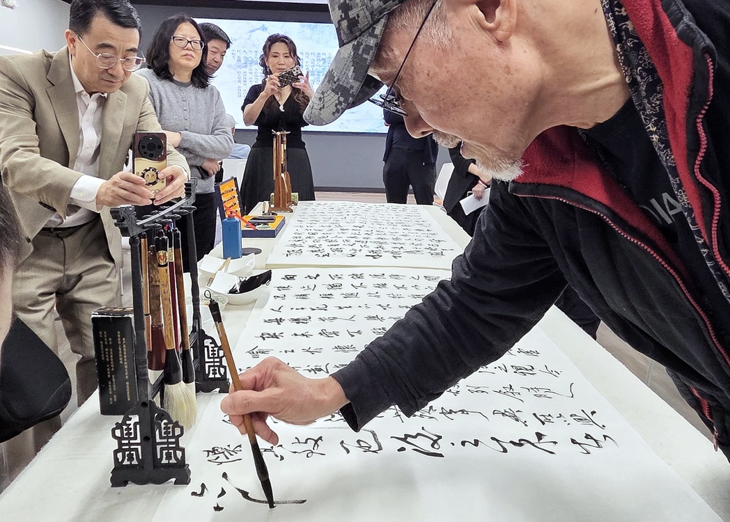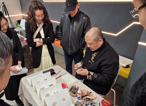 其间,大西洋书法家协会副会长毕云来现场演示篆刻技艺,并在完成的书法作品上钤盖数方印章,为作品增添金石意味。