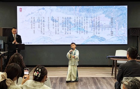 当日雅集的一大亮点,是7岁少年章继平登台朗诵《桃花源记》,并由崔冰辉议员以箫相和。